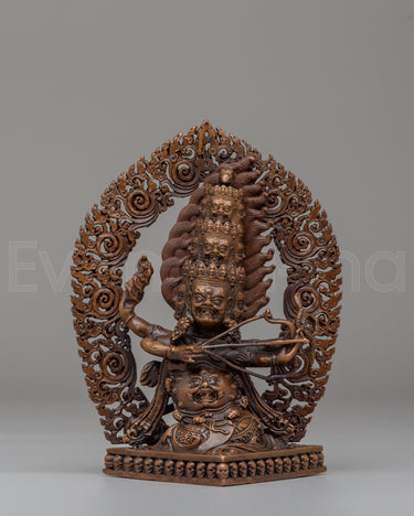 Mahakala is typically depicted as a wrathful deity with a black or dark blue complexion, symbolizing his transcendence of ignorance and ego. Adorned with a crown of skulls, a necklace of freshly severed heads, and three eyes, he represents victory over the cycle of birth and death. Standing over a corpse or symbolic obstacle, his numerous arms wield implements like a trident, chopper, skull cup filled with blood, and a damaru (small drum), signifying his ability to dispel illusions, eliminate hindrances, and protect the Dharma.