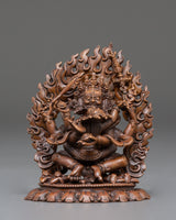 In Tibetan Buddhism, Mahakala is seen as the wrathful protector of dharma and a manifestation of Avalokiteshvara, the Bodhisattva of Compassion. The Four-Armed Mahakala form symbolizes balance and absolute power, with each arm signifying the ability to overcome obstacles, eradicate negativity, protect spiritual wisdom, and cultivate compassion. His furious countenance represents the annihilation of ignorance and the emergence of clarity, assisting practitioners in remaining grounded in meditation and spiritual discipline.