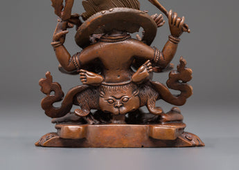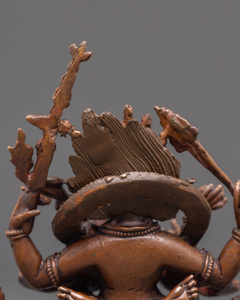 This Buddhist Guardian 4 Armed Mahakala Statue is a wonderfully wrought copper sculpture measuring 8cm in height and 7cm in breadth, weighing 0.24kg. The statue's elaborate craftsmanship highlights Mahakala's furious look, symbolic ornamentation, and detailed form, all of which were carefully molded by expert Himalayan artisans. The warm copper finish heightens its religious atmosphere, making it a great focal point for altars, meditation rooms, or personal spiritual collections. Its modest size enables it to emit protective energy even in smaller sacred spaces.