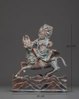 Handcrafted with remarkable precision, this 6.47kg statue captures the fierce presence of Palden Lhamo as she rides her mule across the sea of blood, a powerful symbol of her victory over demonic forces. Made from copper with an antique finish, the sculpture showcases her wrathful expression, intricate ornaments, and sacred implements that embody unstoppable strength, profound wisdom, and unwavering dedication to protecting the Dharma. This exquisite piece of Himalayan artistry not only enhances any space with its striking presence but also serves as a powerful spiritual guardian, inspiring resilience and courage on your journey.