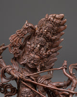 This Dharma Protector Rahula Statue showcases an intricate depiction of Rahula, a powerful protector deity in Tibetan Buddhism. Crafted from oxidized copper, this statue reveals remarkable detailing with multiple arms wielding ritual weapons, symbolizing Rahula’s fierce energy in warding off obstacles and protecting the Dharma. The figure is set against a backdrop of swirling flames, representing the transformative power of wisdom and spiritual protection.