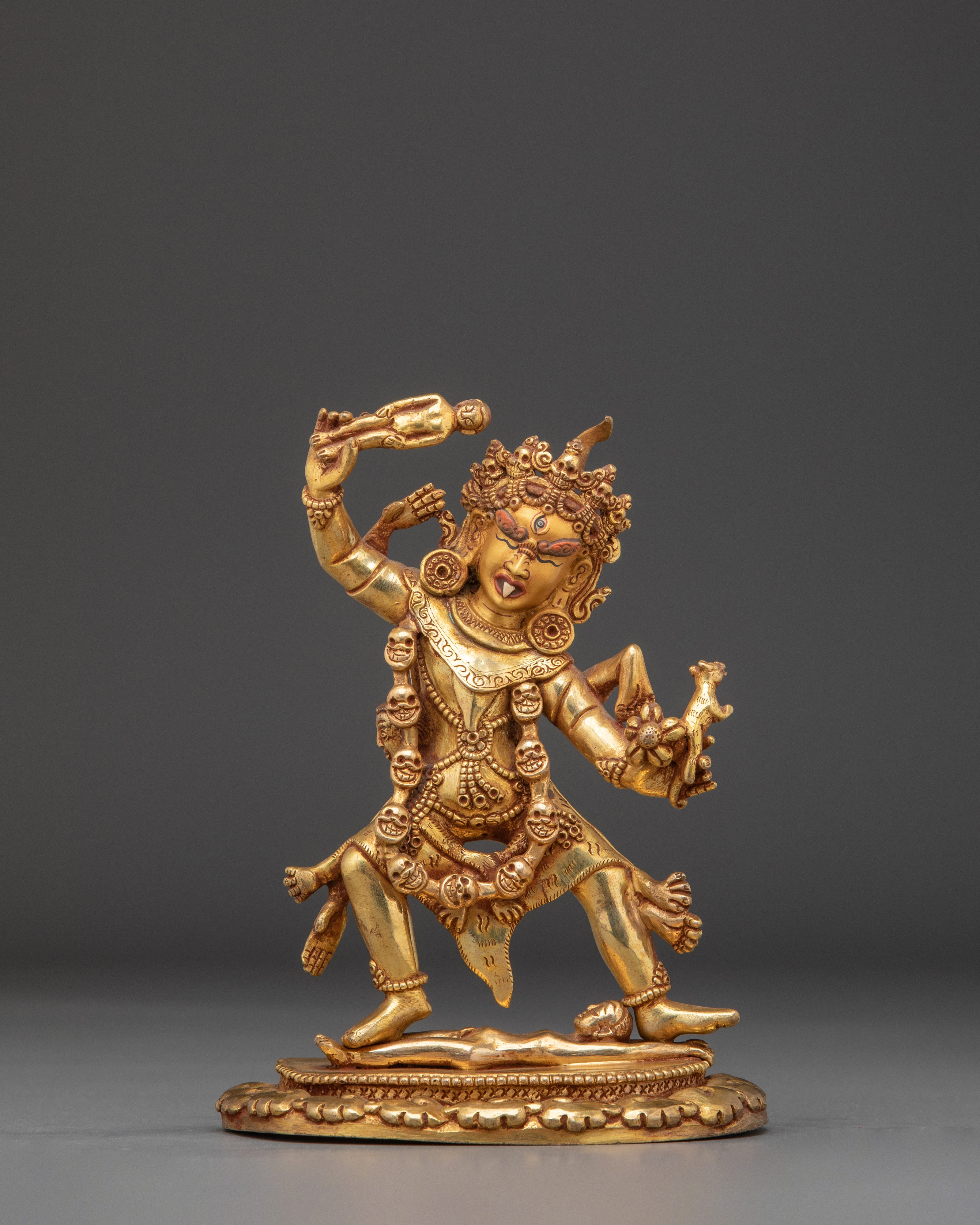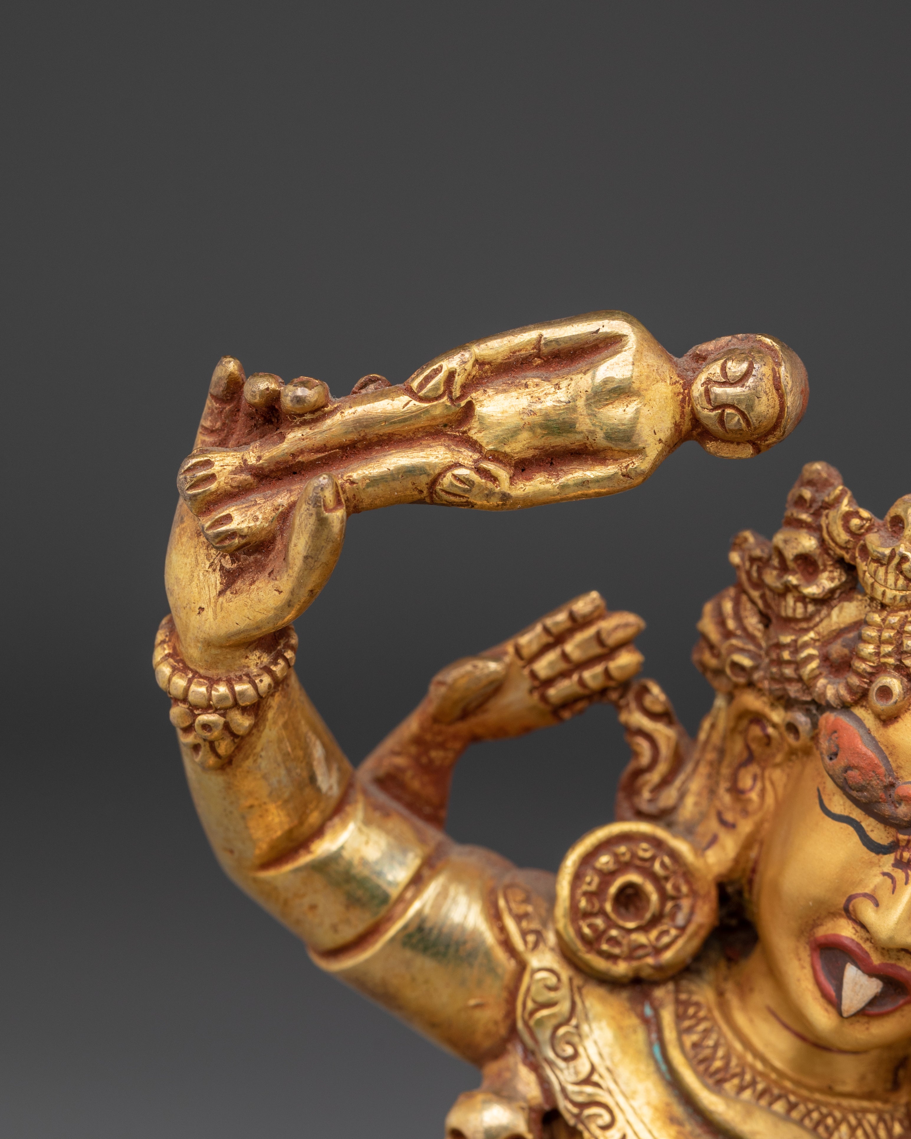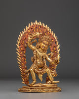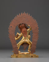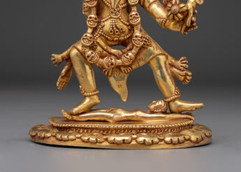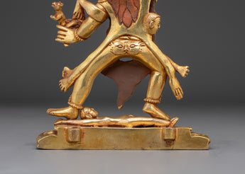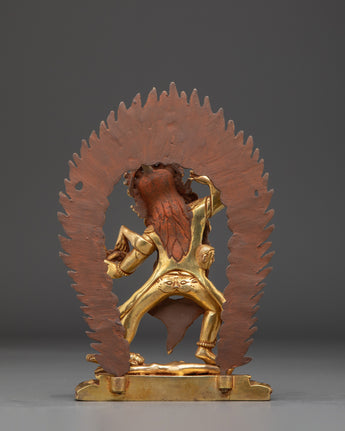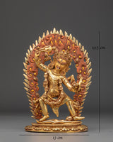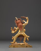 The Handcrafted Ekajati Statue is a powerful representation of the Tibetan Buddhist protector deity, Ekajati, embodying strength, wisdom, and protection. Standing at 19.5cm tall and weighing 1.06kg, this intricately designed statue features a copper body with gold plating and detailed acrylic color accents. Ekajati, known for her fierce form and energy, is often invoked for protection against opposing forces and obstacles. The statue's design portrays her in a dynamic stance, symbolizing victory over ignorance and malevolence, making it a perfect addition to any sacred space or altar.