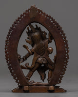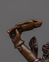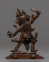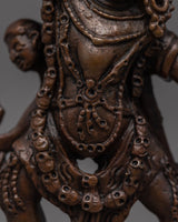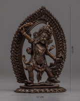The machine-made Ekajati statue is a copper sculpture depicting the wrathful female deity from the Tibetan Buddhist tradition, known for her ferocious appearance and protective qualities. The deity stands atop a human figure, indicating good's victory over evil or negativity. She wears a garland of fresh human heads, and a skull crown extends her left hand toward the sky that holds a corpse club and has her tongue stuck out.