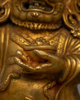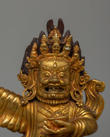 The Mahakala's robe and attire are exquisitely detailed. The fabric's folds and drapes are carefully sculpted to suggest movement and power, creating the impression of a figure actively protecting the spiritual realm. The robe's detailing reflects ancient traditions, with subtle textures and symbols contributing to the statue's profound spiritual symbolism. The gold plating adds to the intricate design, giving the robe a sense of regality and holiness that complements Mahakala's fearsome personality.
