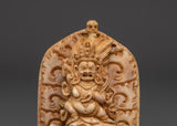 The Mahakala Tibetan Statue is a sacred and powerful depiction of Mahakala, the strong guardian deity revered in Tibetan Buddhism. This delicately hand-carved sculpture, measuring 10cm in height and 7.5cm in breadth, is constructed from responsibly sourced buffalo bone, ensuring both spiritual authenticity and environmental responsibility.