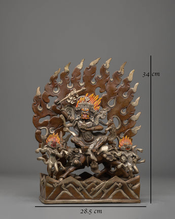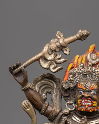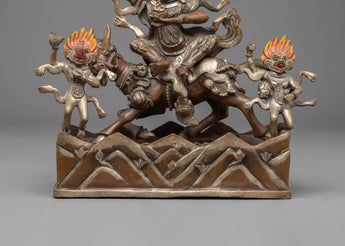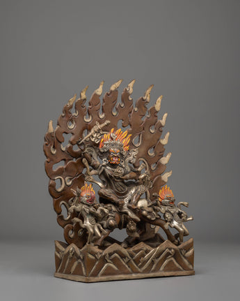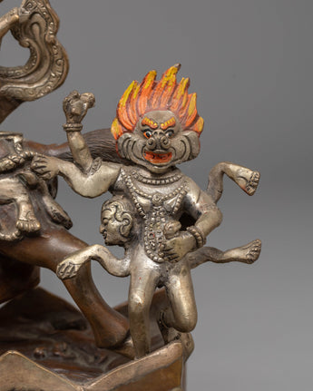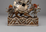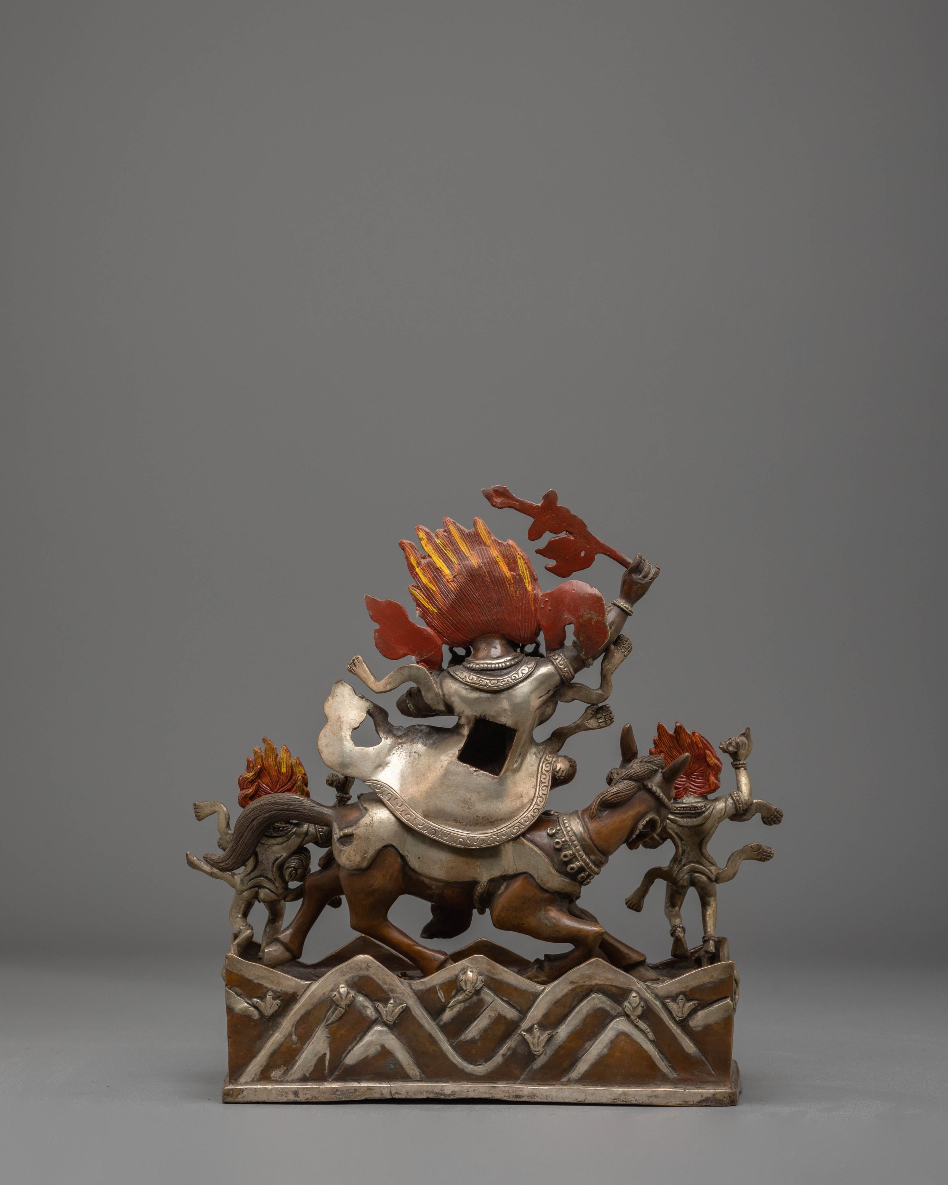 The artistry of this piece is remarkable, capturing Palden Lhamo in her iconic wrathful form as she rides across a dramatic landscape, symbolizing her unstoppable force. Her vivid facial features, accented with fiery orange and red pigments, radiate fierce compassion and unyielding determination. She is surrounded by a blazing halo of flames, representing the purification of ignorance. Intricately detailed ornaments, bone jewelry, and her assertive posture reflect traditional Tibetan iconography, while the silver-plated highlights emphasize divine contrast and depth. Even the mythical mount beneath her is sculpted with exceptional precision, enhancing the statue’s storytelling and spiritual symbolism.