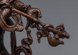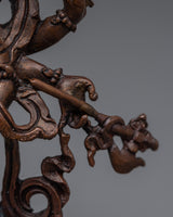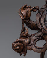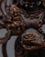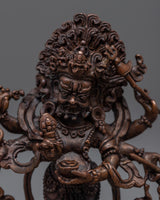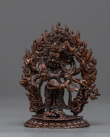 We have exclusively handmade the White Mahakala Mantra using himalayan art style using oxidized copper. It serves multiple purposes, including meditation and Buddhist rituals. Carved in the traditional Art of Nepal, the deity is depicted standing on a sun disc lotus seat with a fierce expression. This sculpture embodies the Buddhist art of the Kathmandu Valley, which has been passed down through generations. Each of the deity's six arms holds a different ritual item; each imbued with significant meaning.