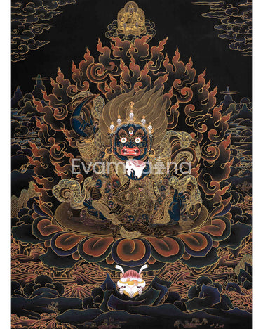 Mahakala, whose name translates to "Great Time" or "Great Black One," holds a prominent and deeply revered position in Vajrayana Buddhism, especially within the Tibetan tradition. Despite his fearsome appearance, Mahakala is not an evil deity but a Dharmapala, a protector of Buddhist teachings.