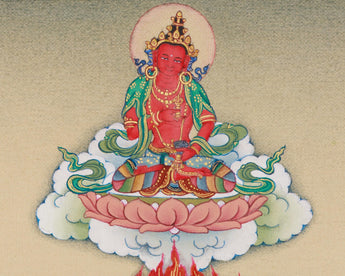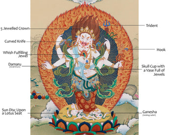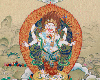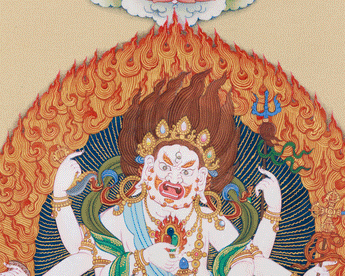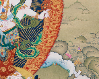 In Vajrayana Buddhism, White Mahakala is regarded as a compassionate protector and an embodiment of Avalokiteshvara, the Bodhisattva of Compassion. Unlike the intimidating black form, White Mahakala symbolizes calming and nurturing qualities—bringing prosperity, removing obstacles, and fostering spiritual and material growth. In this thangka, he stands nobly on a lotus and sun disc, encircled by a vivid halo of sacred flames representing transformation. His white figure symbolizes purity and strength, with six arms holding tools that represent his divine roles of protecting, nurturing, and blessing. The surrounding landscape, painted in the Karma Gadri style, enhances his fierce yet compassionate presence.