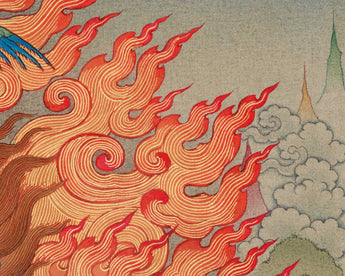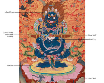 In the Sakya tradition, Mahakala is honored as the fierce protector of the Dharma and embodies compassion in a wrathful guise. His dark blue form symbolizes the vastness of dharmakaya—the ultimate, formless truth. Sitting on a lotus and sun disc, he wields a curved knife, skull cup, and ritual staff, which represent severing ignorance and transforming negativity into enlightenment. The flaming halo around him signifies the destruction of delusion, while his five-skull crown illustrates the transformation of the five poisons into five wisdoms. Every aspect of the Sakya Mahakala painting radiates spiritual power and protective energy, visually representing divine strength and authority.