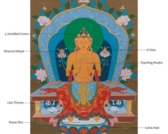 Maitreya holds significant historical and spiritual significance in Mahayana Buddhism, as he is considered the next Buddha to renew the Dharma, bring peace, and liberate suffering. The thangka features Maitreya's hands in the Teaching Gesture, symbolizing the turning of the wheel of Dharma. He holds lotus stems, a vase of immortality nectar, and a Dharma wheel, underscoring his role as the future spiritual teacher. His five-jeweled crown represents his enlightened qualities, while the elaborate lion throne, supported by mythical snow lions, enhances his royal and divine presence. This thangka embodies sacred symbolism and fine artistry, making it a meaningful piece for meditation, devotion, and interior display.