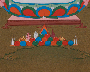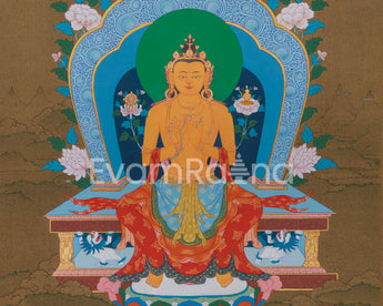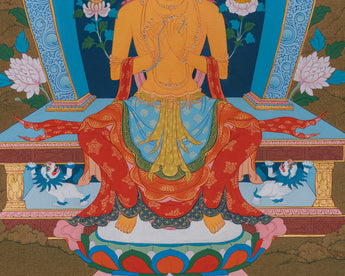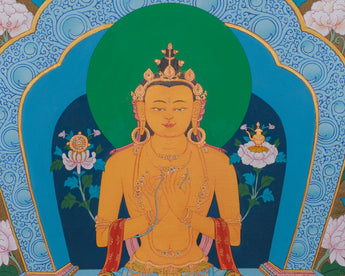 The Buddha Maitreya Thangka is expertly hand-painted in our studio on cotton canvas using acrylic colors and genuine 24K gold. The renowned Karma Gadri Style guides its execution. Karma Gadri manner strongly emphasizes spacious backgrounds, gentle landscapes, and accurate iconography. The layering of 24K gold in this thangka enhances the visual harmony and spiritual atmosphere by casting a brilliant glow over Maitreya's crown, garments, and throne. His legs rest evenly on the moon disc and lotus seat, symbolizing the readiness to rise and descend to the human realm. This position reflects his transitional state in Tushita Heaven, but he is prepared to appear in the world when the teachings of Shakyamuni fade.