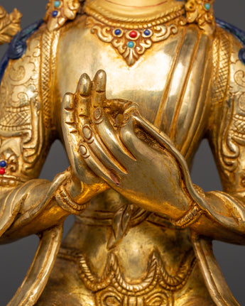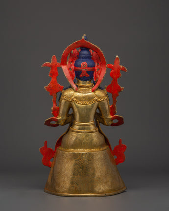 Maitreya, also known as the future Buddha in Buddhist traditions, is depicted in a peaceful, seated position with hands in the gesture of teaching. The vibrant gemstone inlays (turquoise, coral, and lapis lazuli) represent wisdom, vitality, and spiritual purity. The superb craftsmanship and golden finish give this statue a brilliant appearance, representing Maitreya's function as a symbol of compassion and hope for future enlightenment. His tranquil expression and exquisite lotus pedestal accentuate his celestial presence.