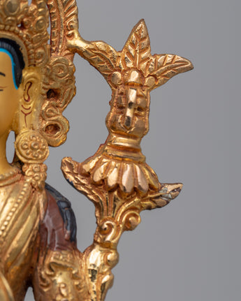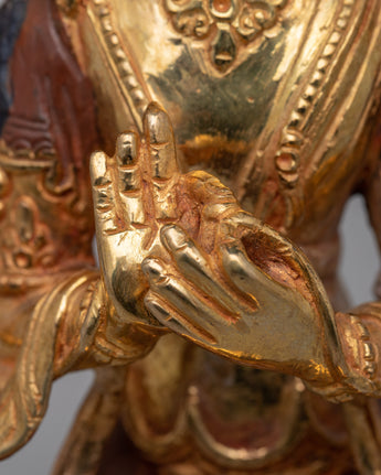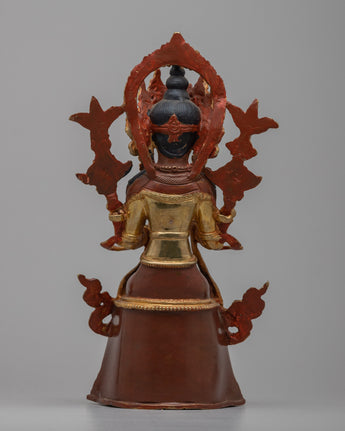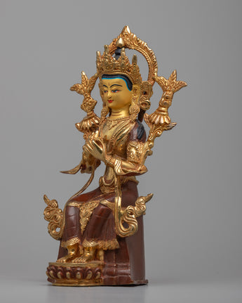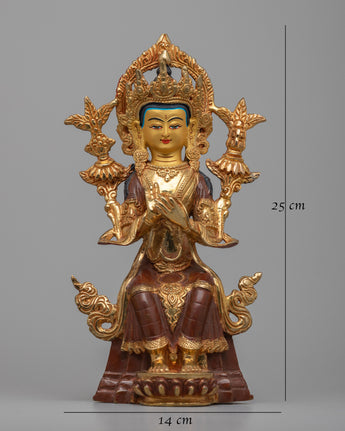 The statue, which was painstakingly crafted with devotion, captures the spirit of Maitreya, the future Buddha, who holds the hope of a compassionate and enlightened age to come. A celestial radiance is added by the bright gold plating, which represents Maitreya's transcendental wisdom and compassion. The Maitreya Future Buddha Statue is a potent symbol of hope and spiritual a renewal that can be placed in your meditation corner, home shrine, or holy altar to help you on your journey to enlightenment and liberation.