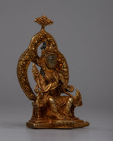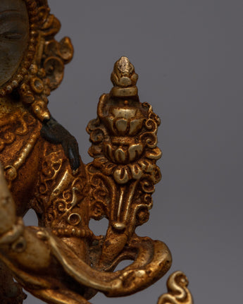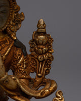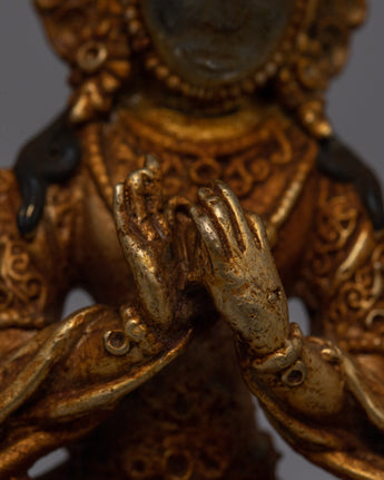 The Maitreya, The Future Buddha Statue, represents the compassionate and enlightened future Buddha, Maitreya. Handcrafted with precision and care on a copper body, this statue exudes longevity and a sense of traditional craftsmanship. Enhanced with crystal stones, it exudes spiritual energy and importance, encouraging believers to connect with Maitreya's enlightened presence.
