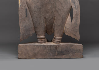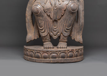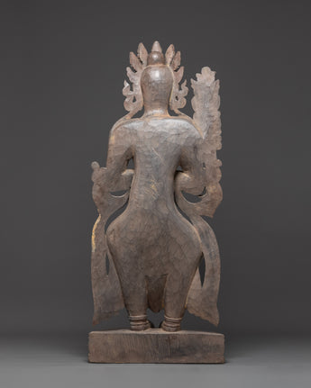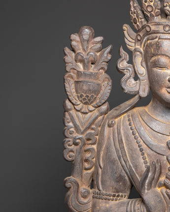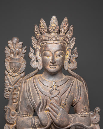 The statue, crafted from wood, features amazing detailing in Maitreya's crown, clothes, and tranquil demeanor. The figure is depicted in a meditation pose, with hands in the dharmachakra mudra, which represents the turning of the Wheel of Dharma. The lotus pedestal base denotes purity and spiritual awakening, and the natural grain of the wood adds to its eternal beauty. This handcrafted masterpiece exemplifies Himalayan workmanship and holds profound metaphorical importance.