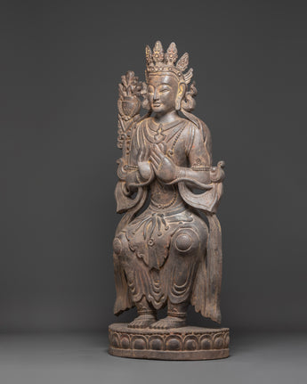 This majestic wooden statue of Future Buddha Maitreya represents the promise of compassion, hope, and enlightenment. Standing 128cm tall, 53cm wide, and weighing 17.75kg, this enormous handcrafted work is suitable for Buddhist temples, shrines, and meditation rooms. Maitreya, the Future Buddha, is revered as the embodiment of universal loving-kindness who will appear to guide beings to liberation. This magnificent monument acts as both a spiritual figure and an inspiration to practitioners.