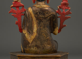 The exquisite gold-plated copper body is adorned with traditional Tibetan motifs, including beautiful patterns on Maitreya's robe and the lotus pedestal, resulting in a harmonious blend of spirituality and beauty. The brilliant acrylic color accents on the backdrop enhance the statue's beauty, lending it a sense of vividness and liveliness. This Tibetan Maitreya Buddha statue is perfect for meditation areas, altars, or as a symbol of compassion, future hope, and the never-ending cycle of spiritual progress.