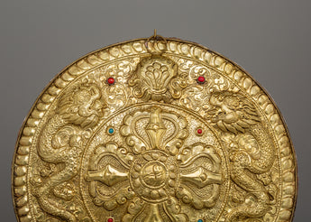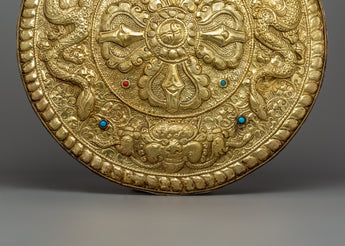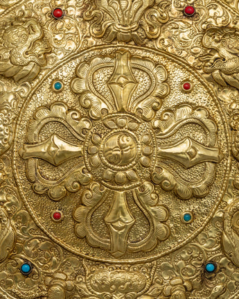 The Bishwa Vajra, located in the middle of the Mandala, represents spiritual power, knowledge, and compassion. The two fearsome dragons on the left and right sides of the Vajra represent strength and protection, respectively. The Kirtimukha, also known as Chhepu, serves mainly as a significant guardian of the threshold. The Offering symbol on top denotes generosity and compassion. This Mandala is a practical meditation, spiritual practice tool, and eye-catching décor for any sacred location.