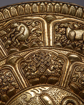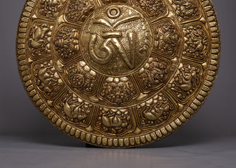 The Wall Hanging Brass Om Mandala is an example of both artistic elegance and spiritual importance. It is a handcrafted brass piece with the sacred symbol "Om" carved beautifully in the center, exuding divine energy and serenity. Exquisitely carved symbols of auspiciousness surround the Om symbol, adding to the mandala's spiritual character. Furthermore, the outer margins are decorated with all the signs of the Tibetan Zodiac, signifying a harmonious union with heavenly energies.