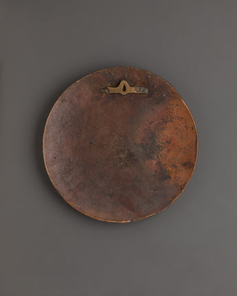 This bronze-made wall hanging, masterfully crafted from bronze, is designed to bring both cultural richness and lasting beauty into your home, adding a touch of creativity and the wisdom of the Shakyamuni Buddha to your room. This item, measuring 23 cm in diameter and weighing 2.06 kg, is a tribute to craftsmanship and elegant metalwork. It is the perfect focal point for meditation spaces, foyers, or interior designs due to its round shape and substantial feel.