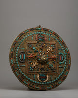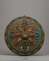 A masterwork of spiritual creativity, the Copper Mandala Yoga Round is craefully created to enhance your home's décor or meditation area. Crafted with accuracy on a copper frame, it radiates a classic elegance and dignity. Every minute feature, such as the deft filigree work and the inlays of conch, turquoise, lapis lazuli, and coral, bears witness to the delicate attention to detail and passion that went into its production.
