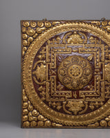 This stunning Hand-Carved Brass Metal Thangka Wall Hanging with Gold Plating is a masterwork of Tibetan Buddhist art, standing 60 cm tall, 59 cm wide, and weighing 3.88 kg. It has been hand-carved with amazing precision and has an elaborately crafted central mandala surrounded by symbolic motifs and geometric patterns that reflect the cosmos and the spiritual journey to enlightenment. The golden relief work highlights its divine importance, making it an excellent complement to religious spaces, homes, or temples.