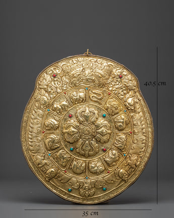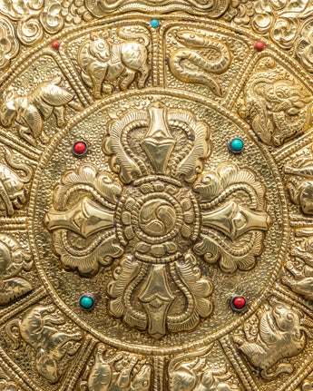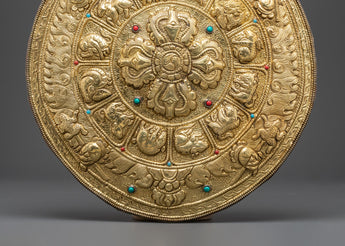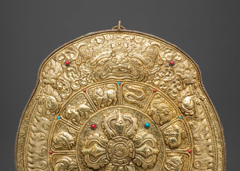 The Tibetan Brass Vajra Wall Hanging is a potent spiritual emblem of Tibetan Buddhism, representing protection, strength, and enlightenment. This masterfully constructed wall hanging is 40.5cm in height and 35cm in width, with a brass body and elaborate inlays of artificial stones such as coral and turquoise. The Vajra, which represents the universe's indestructibility, is the centerpiece of this beautiful work. This wall hanging, which has traditionally been used to summon divine protection and knowledge, reminds us of Tibetan Buddhism's sacred teachings and protective forces.
