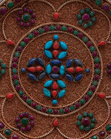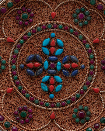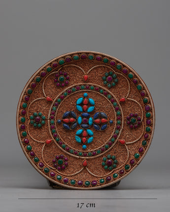 The Wall Hanging Decorative Plate showcases the elegance of artisanal craftsmanship. This plate, handcrafted from copper and elegantly silver plated, exudes beauty and class. Its exquisite design is complemented by the inlay of turquoise, lapis lazuli, and artificial coral stones, which lend a burst of color and texture to the brilliant surface.