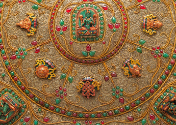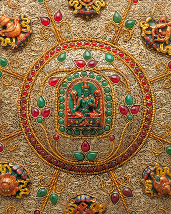 At the heart of this exquisite artwork sit revered deities — Shakyamuni Buddha, the enlightened teacher representing wisdom and compassion; Guru Rinpoche (Padmasambhava), the founder of Tibetan Buddhism who dispels obstacles and negativity; Manjushri, the Bodhisattva of transcendent wisdom; Green Tara, the compassionate savior known for swift protection; and Medicine Buddha, the divine healer symbolizing restoration and well-being. Surrounding them are auspicious symbols — the lotus, conch, and endless knot — all hand-carved with precision, forming a celestial mandala that embodies enlightenment and harmony.