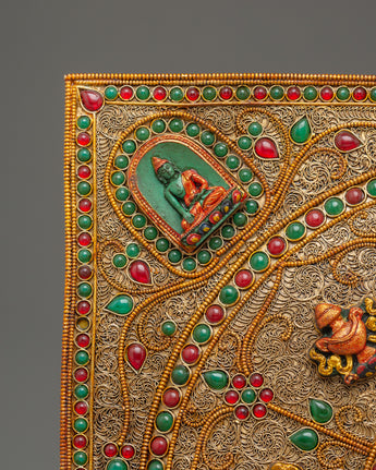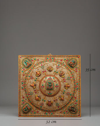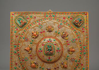 This Handmade Tibetan Wall Hanging for Decor is a magnificent piece of sacred Himalayan artistry, symbolizing harmony, wisdom, and spiritual protection. Measuring 35cm (Height) x 32cm (Width) and weighing 0.95kg, it features a copper body adorned with delicate filigree work and embedded artificial turquoise and coral stones. The intricate mandala design radiates balance and serenity, with each element carrying a more profound spiritual significance rooted in Tibetan Buddhism.