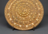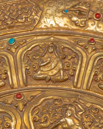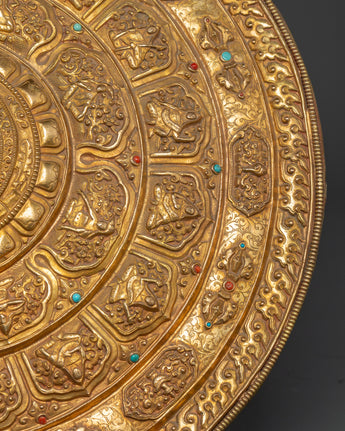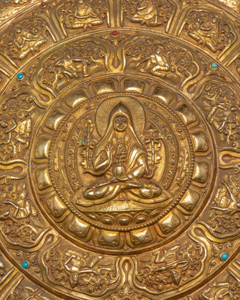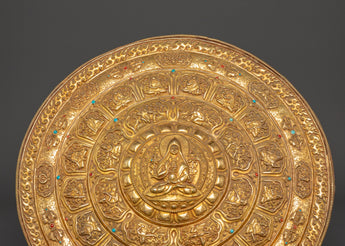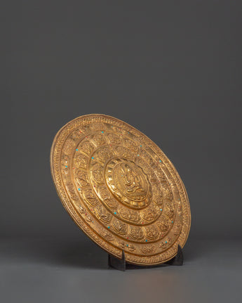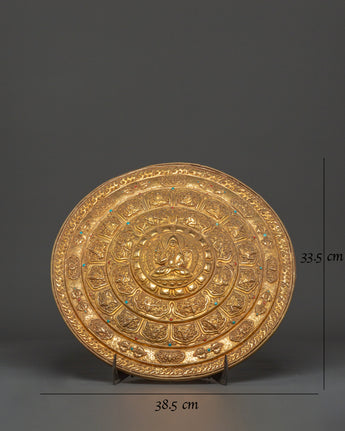 Crafted by expert artisans, this gold-plated mandala displays the traditional Tibetan art of delicate work, in which every detail is precisely carved to reflect sacred Buddhist symbols and patterns. The primary figure of Tsongkhapa is surrounded by beautiful patterns, symbolizing the spiritual path and yearning for enlightenment. The stand enhances the mandala's elegance, displaying it on altars, tables, or sacred areas. This Buddhist ceremonial plate serves as a tool for meditation, spiritual focus, and ritual activities, and is a gorgeous piece. Its brilliant golden finish and meticulously crafted designs honor Tibetan Buddhism's rich past.