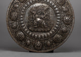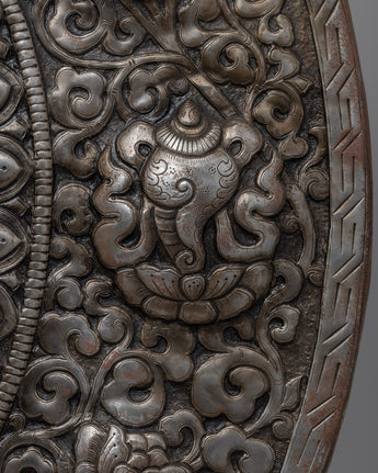 The circular pattern of this metal thangka represents wholeness and the endless essence of the universe. Vajrapani, the central figure, is beautifully painted wielding a vajra, as sign of indestructibility and spiritual power in a dynamic position that conveys strength and determination. Surrounding Vajrapani are the Eight Auspicious Symbols (Ashtamangala), each with profound spiritual meaning, ranging from the Lotus representing purity to the Dharma Wheel encapsulating Buddha's teachings. Together, these symbols form a harmonic mandala that channels blessings, protection, and enlightenment. This thangka is not just a work of beauty, but also a powerful spiritual item, attracting energy that empowers, purifies, and encourages those on the path to enlightenment.
