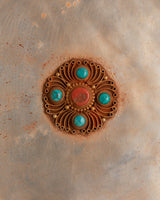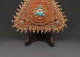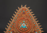 The delicate workmanship is further accentuated by imitation coral and turquoise inlays, representing life force energy and spiritual clarity. Weighing 2.81kg, this artwork has both visual impact and spiritual gravity. Each flame-like motif surrounding the mandala emphasizes its position as a potent spiritual gateway. At the same time, the rich texture and craftsmanship represent the sacred shape and ritual symbolism important to Vajrayana Buddhist art.