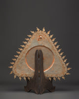 This exquisite Vajrayogini Symbol Wall Hanging is skillfully handcrafted in the Himalayan style. This triangle mandala panel, which measures 45cm in height and 43cm in width, is made of copper and plated in beautiful gold and silver. The design revolves around Vajrayogini's symbolic presence, which exudes power, wisdom, and liberation, making it an ideal focal point for meditation rooms, altars, or spiritual sanctuaries.