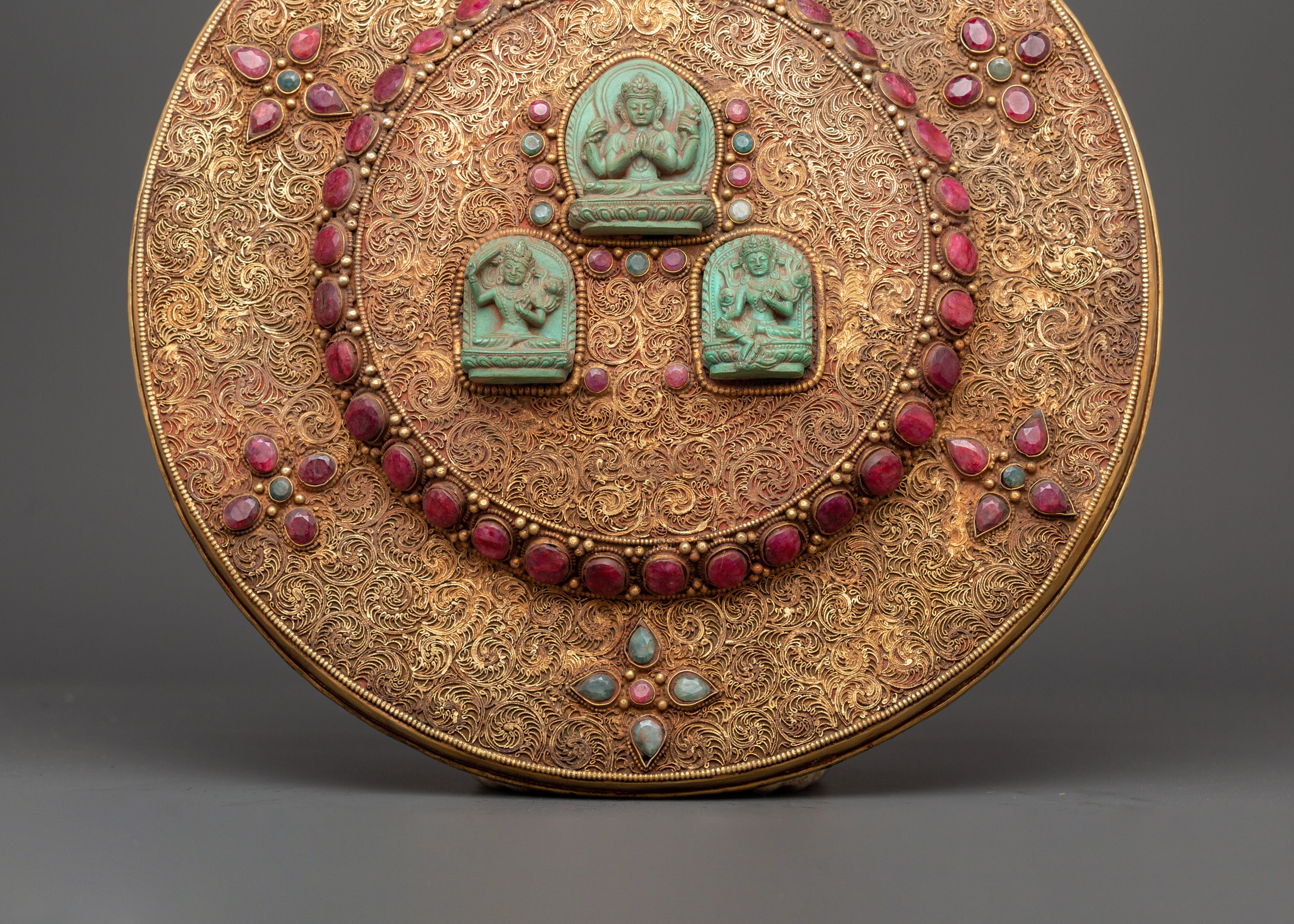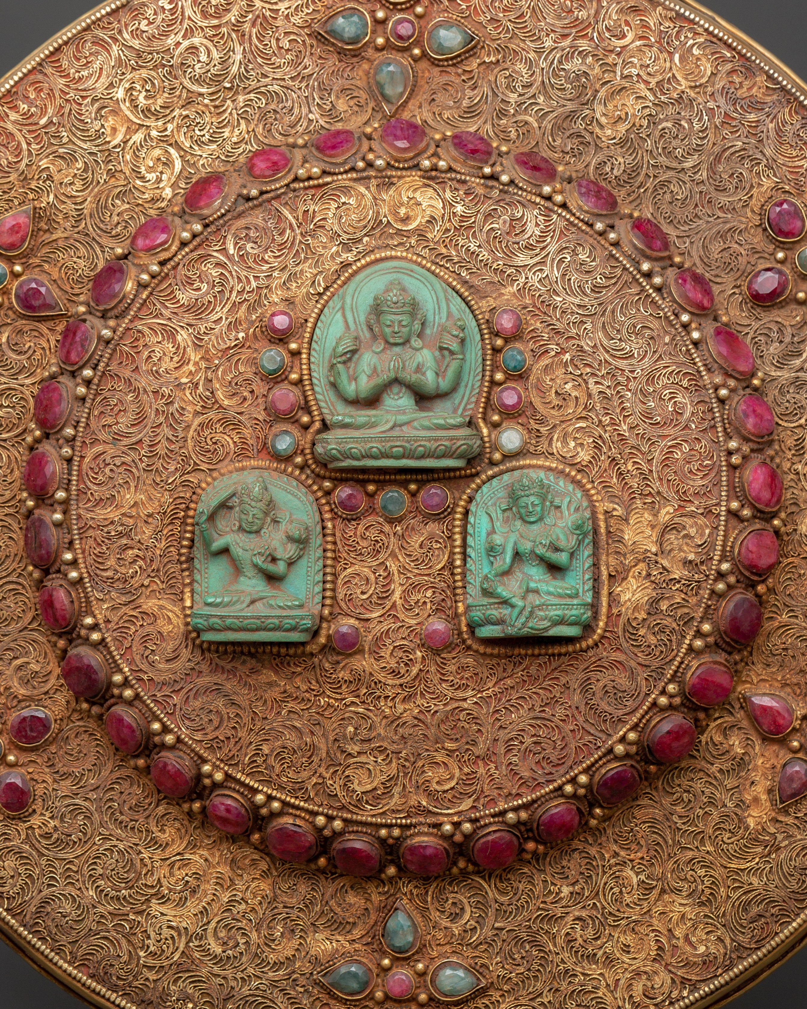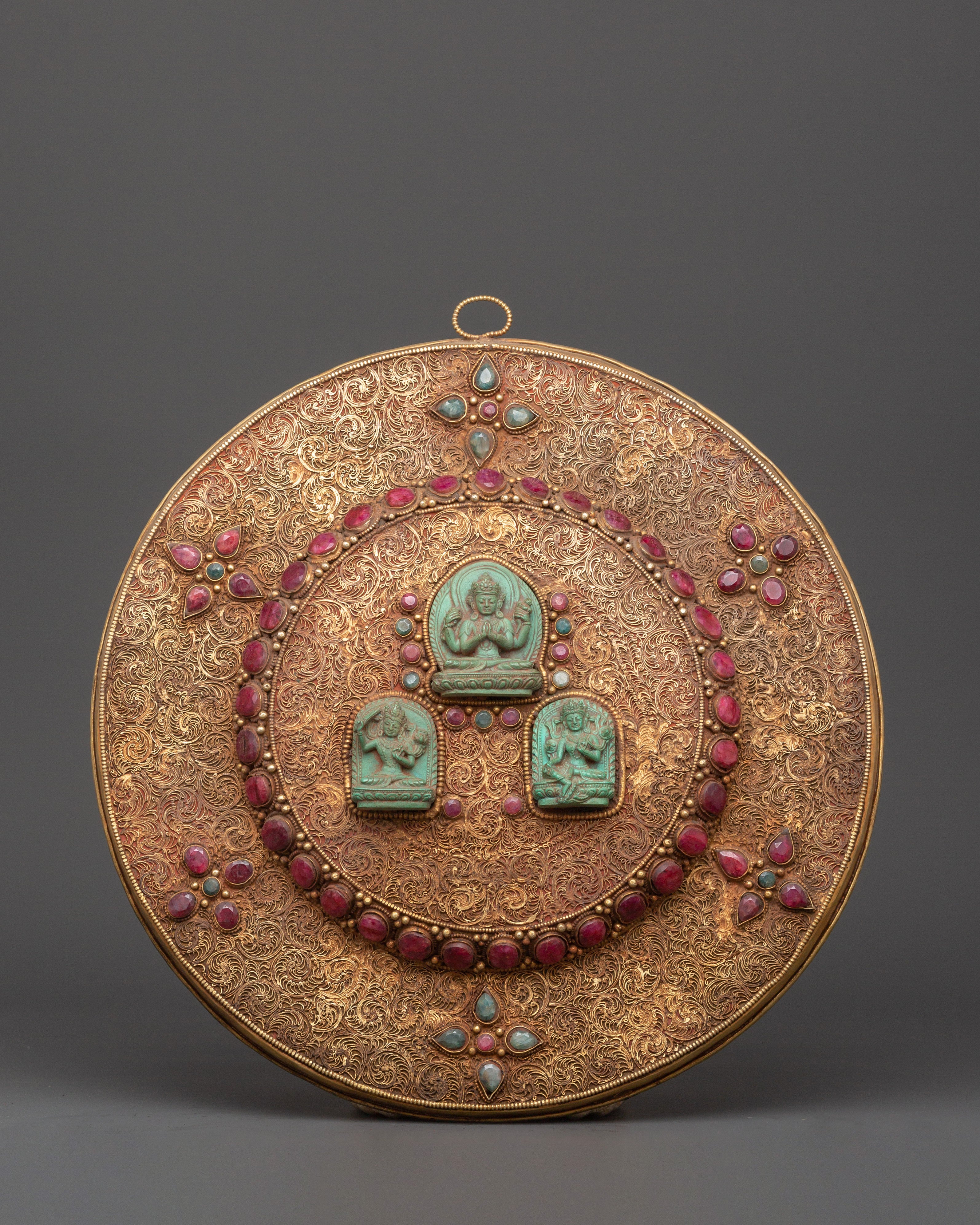 This magnificent wall hanging depicts the divine presence of Bodhisattvas, expertly carved in stone and beautifully inlaid on a mandala. The item is made of copper and completed with electro gold and silver plating. It features artificial gemstones such as ruby, coral, turquoise, and lapis lazuli. Three gentle Bodhisattva figurines at the center radiate serenity and spiritual energy, bringing calm to your sacred space.