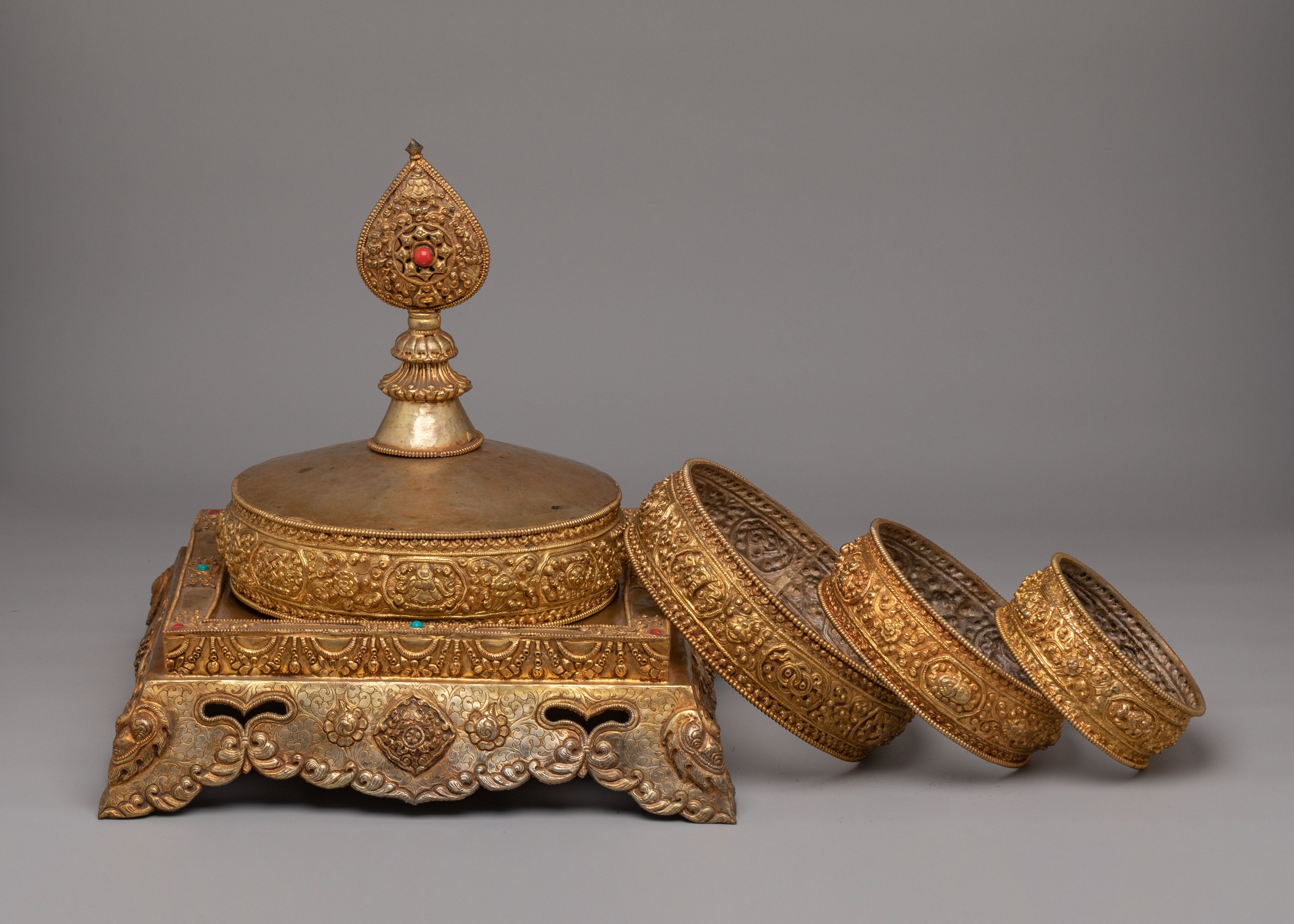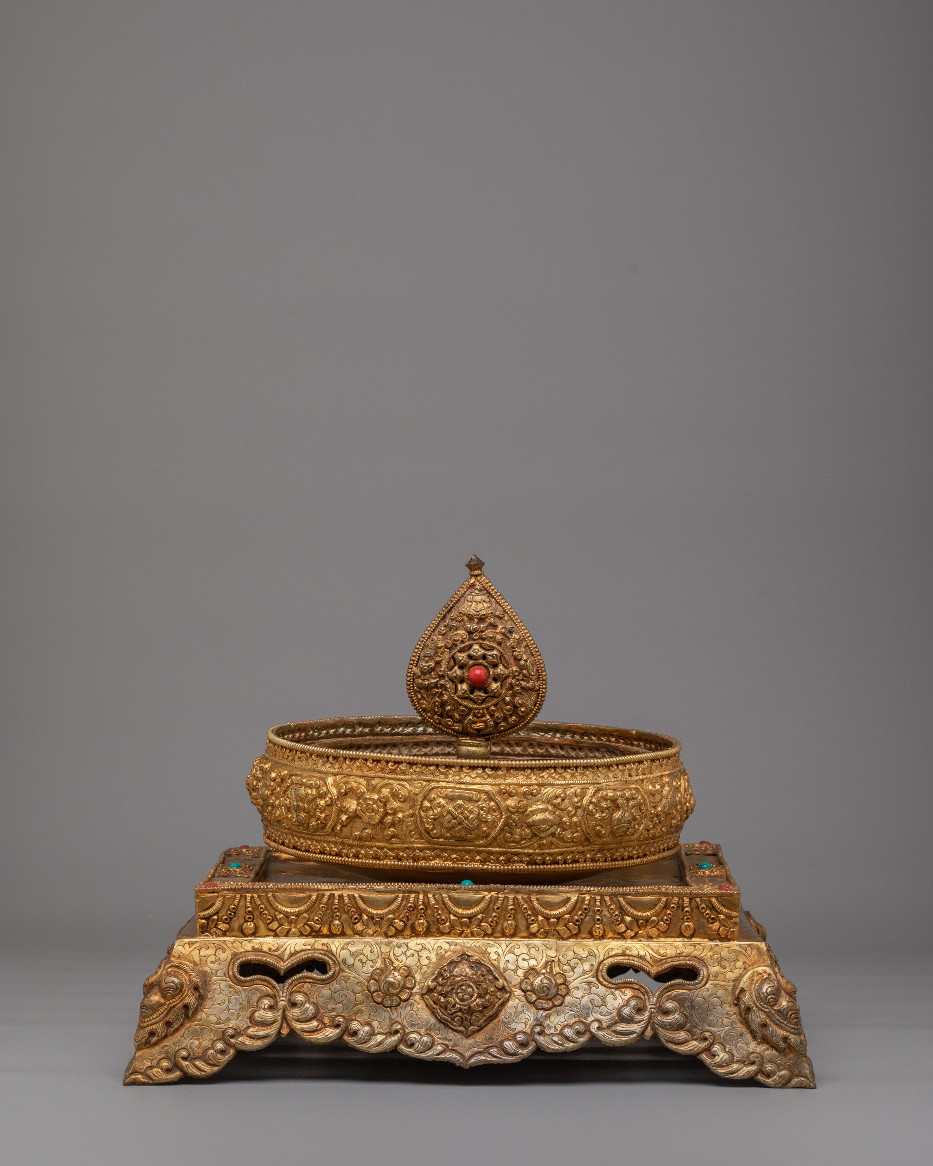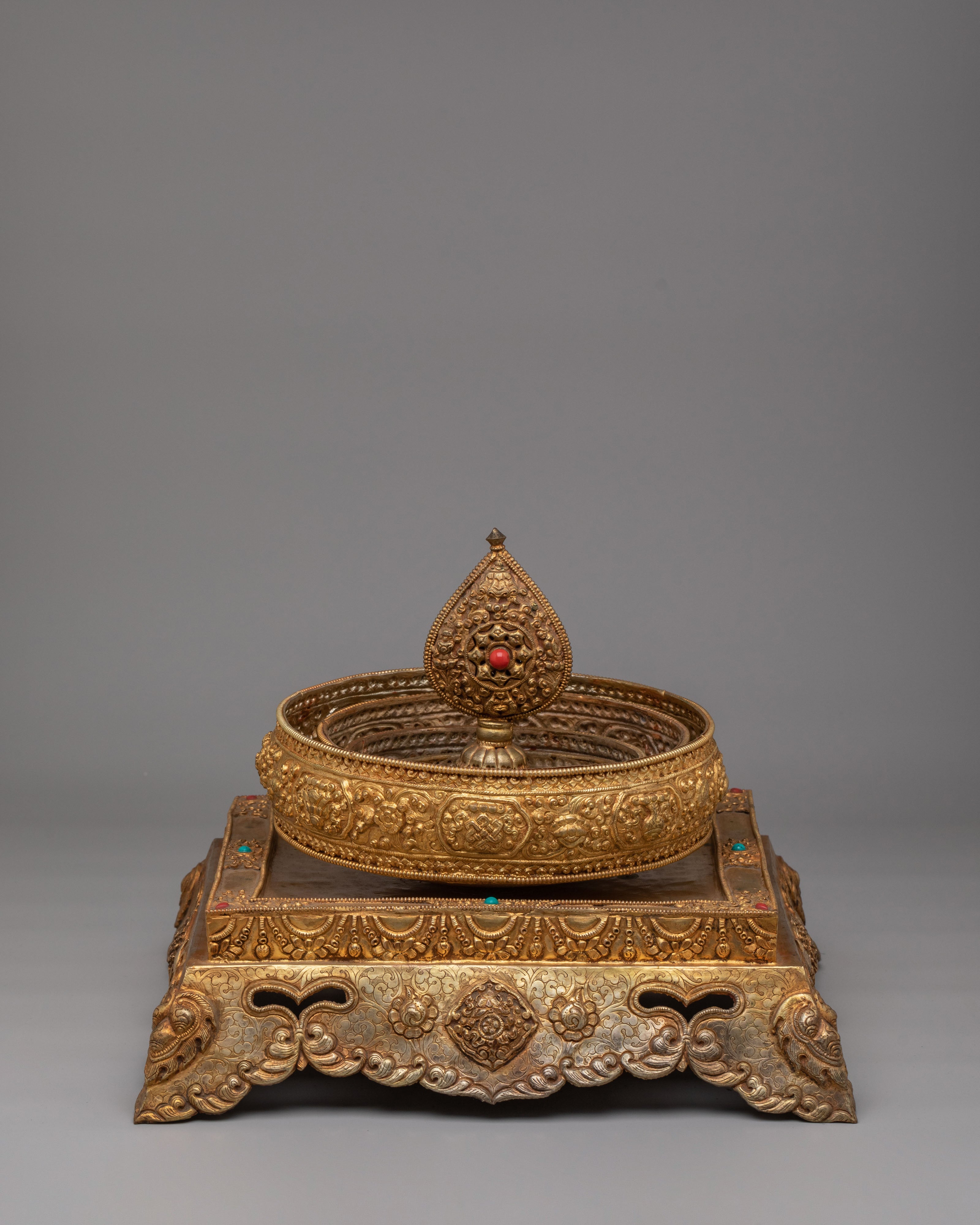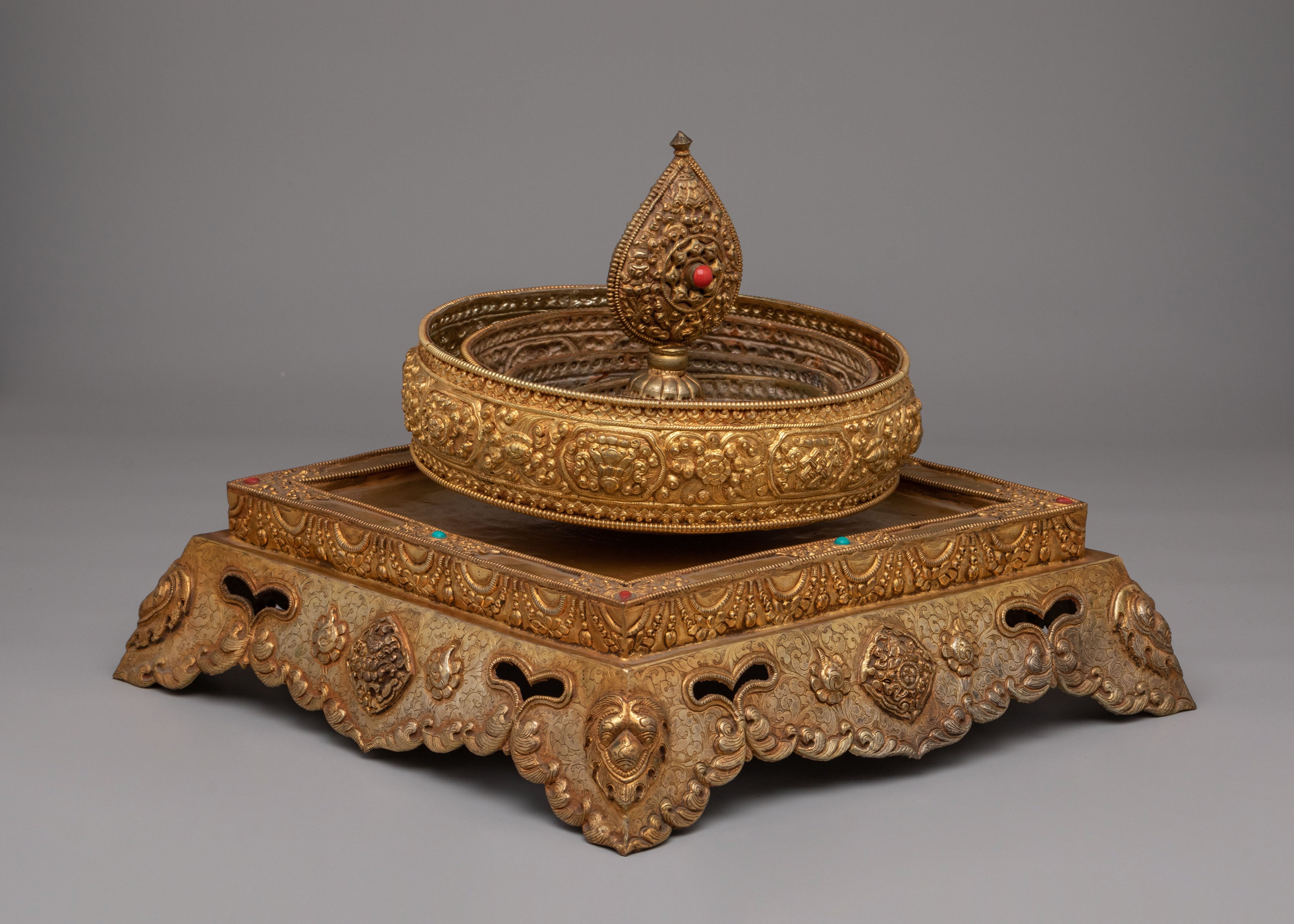 This Sacred Tibetan Mandala reflects the profound depth of Buddhist philosophy. The multi-tiered structure symbolizes the journey to spiritual awakening, with each layer representing different stages of enlightenment. The central red gemstone at the top signifies wisdom and clarity, while the surrounding gold-plated patterns embody harmony, unity, and the interconnectedness of all life. The Mandala’s geometric shapes align with the energy flow of the universe, offering a focal point for meditation and a reminder of the cyclical nature of existence. The Tibetan symbols integrated into the design bring protection, peace, and balance to the practitioner’s mind and spirit.