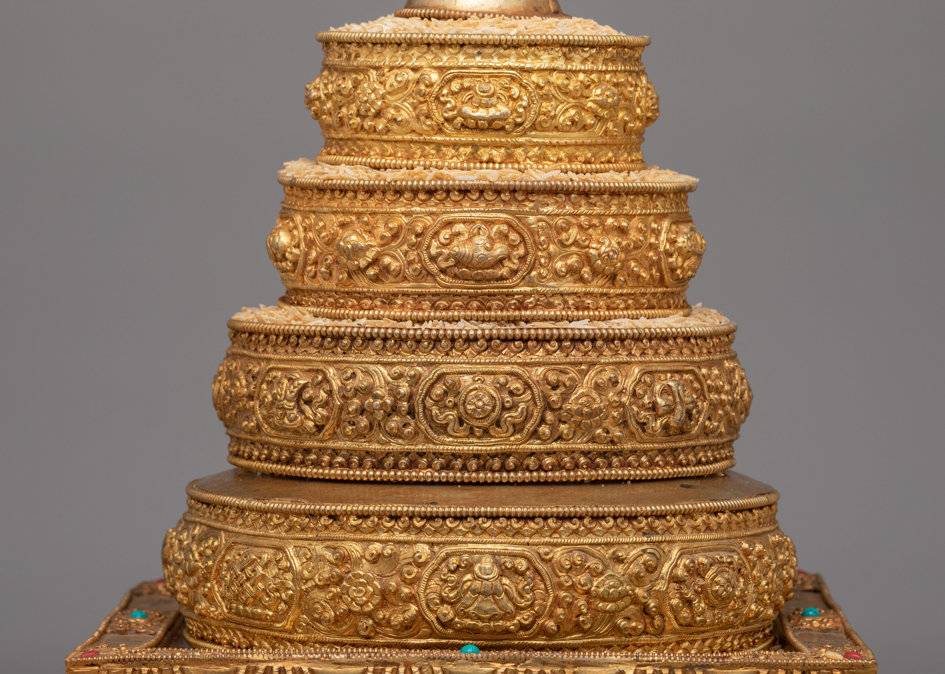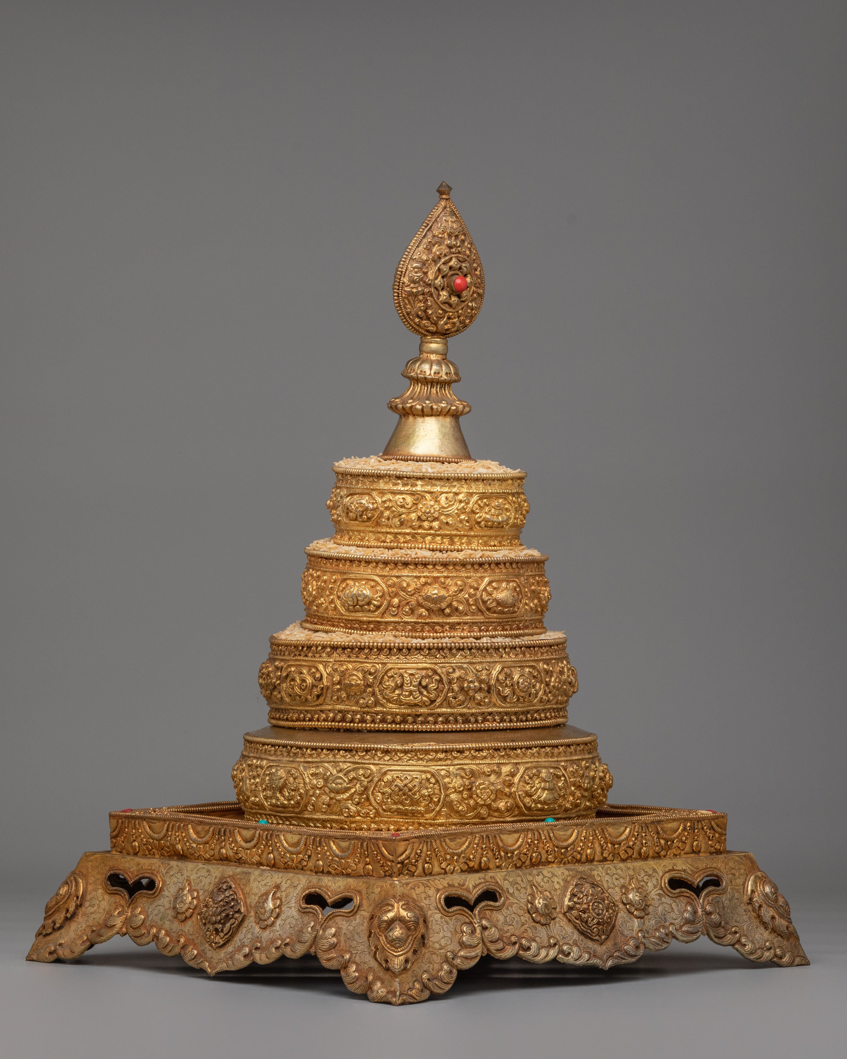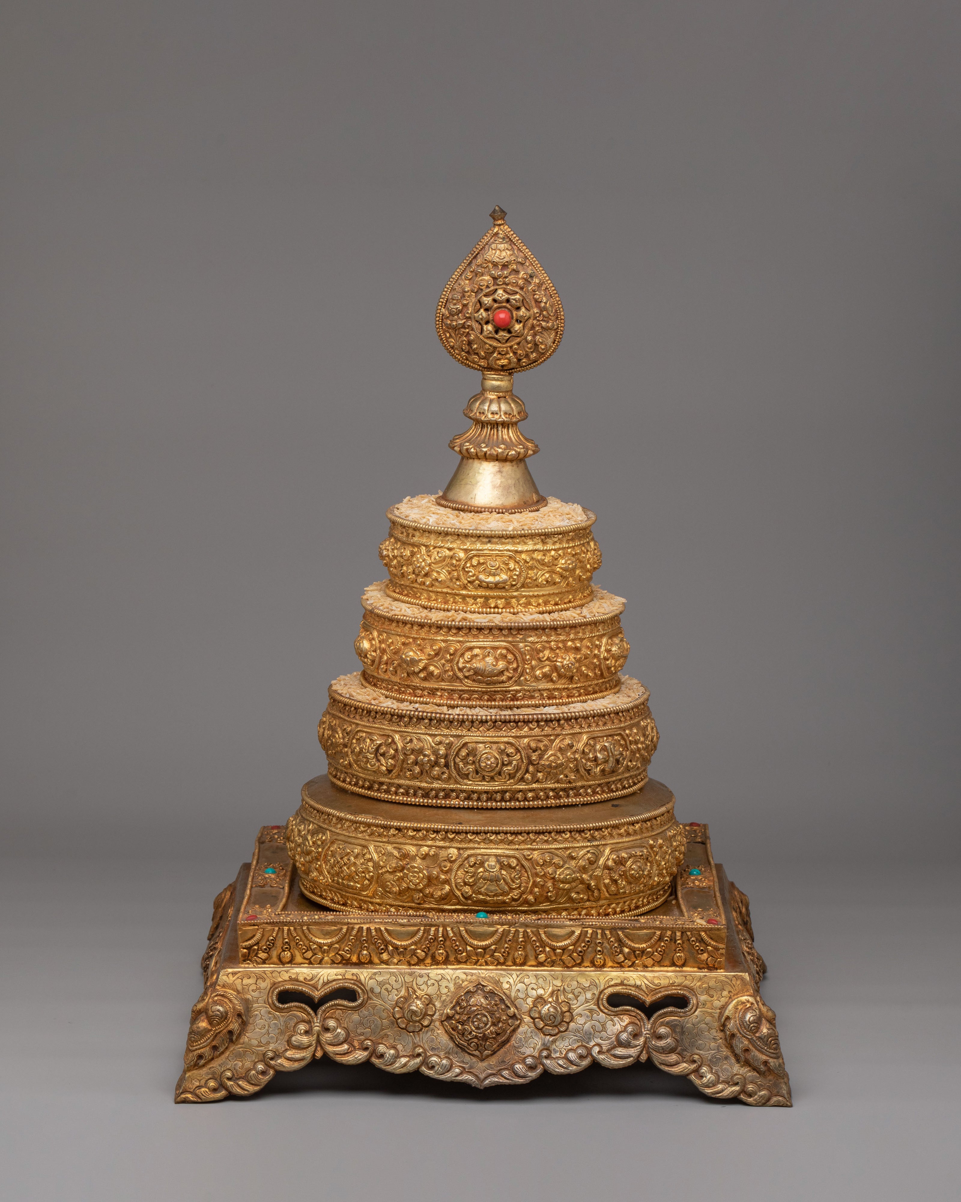 This Sacred Tibetan Mandala reflects the profound depth of Buddhist philosophy. The multi-tiered structure symbolizes the journey to spiritual awakening, with each layer representing different stages of enlightenment. The central red gemstone at the top signifies wisdom and clarity, while the surrounding gold-plated patterns embody harmony, unity, and the interconnectedness of all life. The Mandala’s geometric shapes align with the energy flow of the universe, offering a focal point for meditation and a reminder of the cyclical nature of existence. The Tibetan symbols integrated into the design bring protection, peace, and balance to the practitioner’s mind and spirit.
