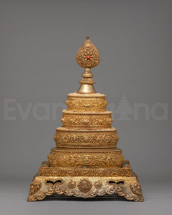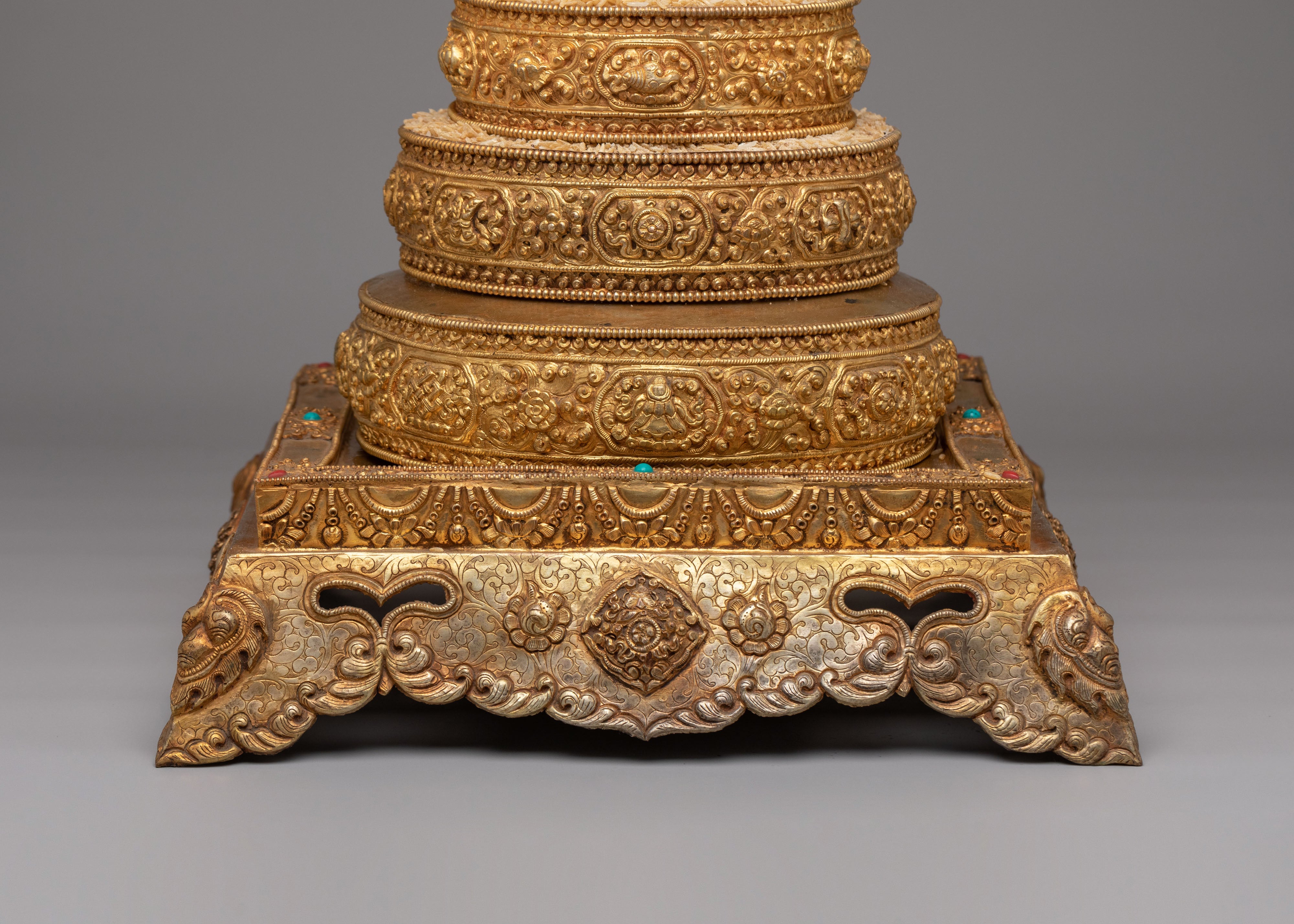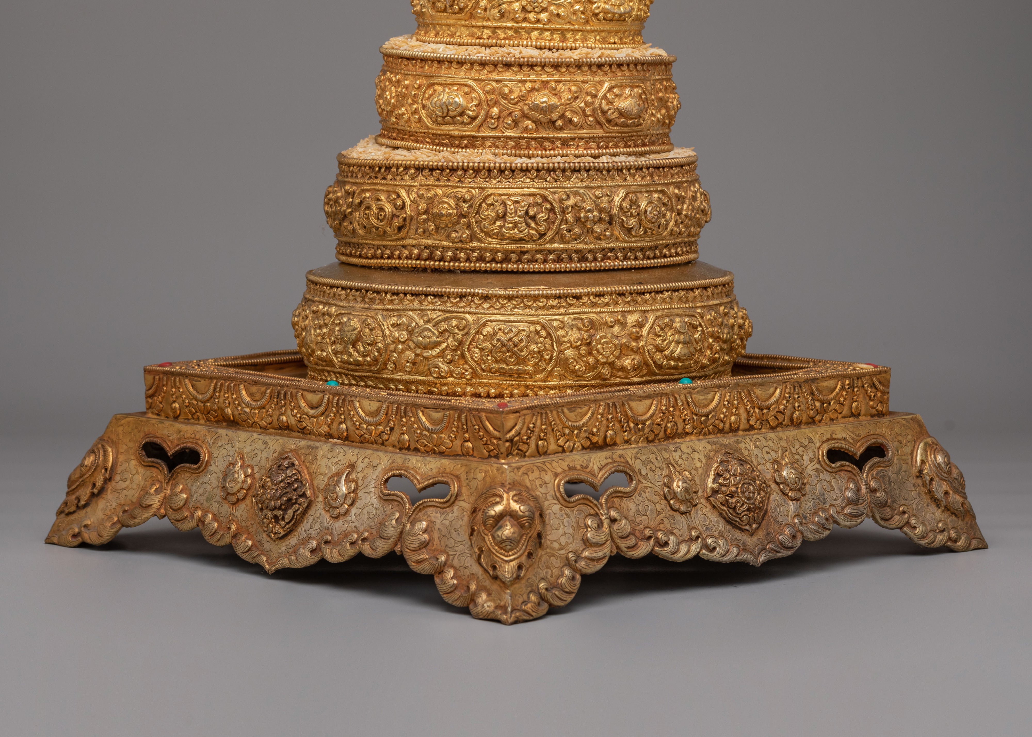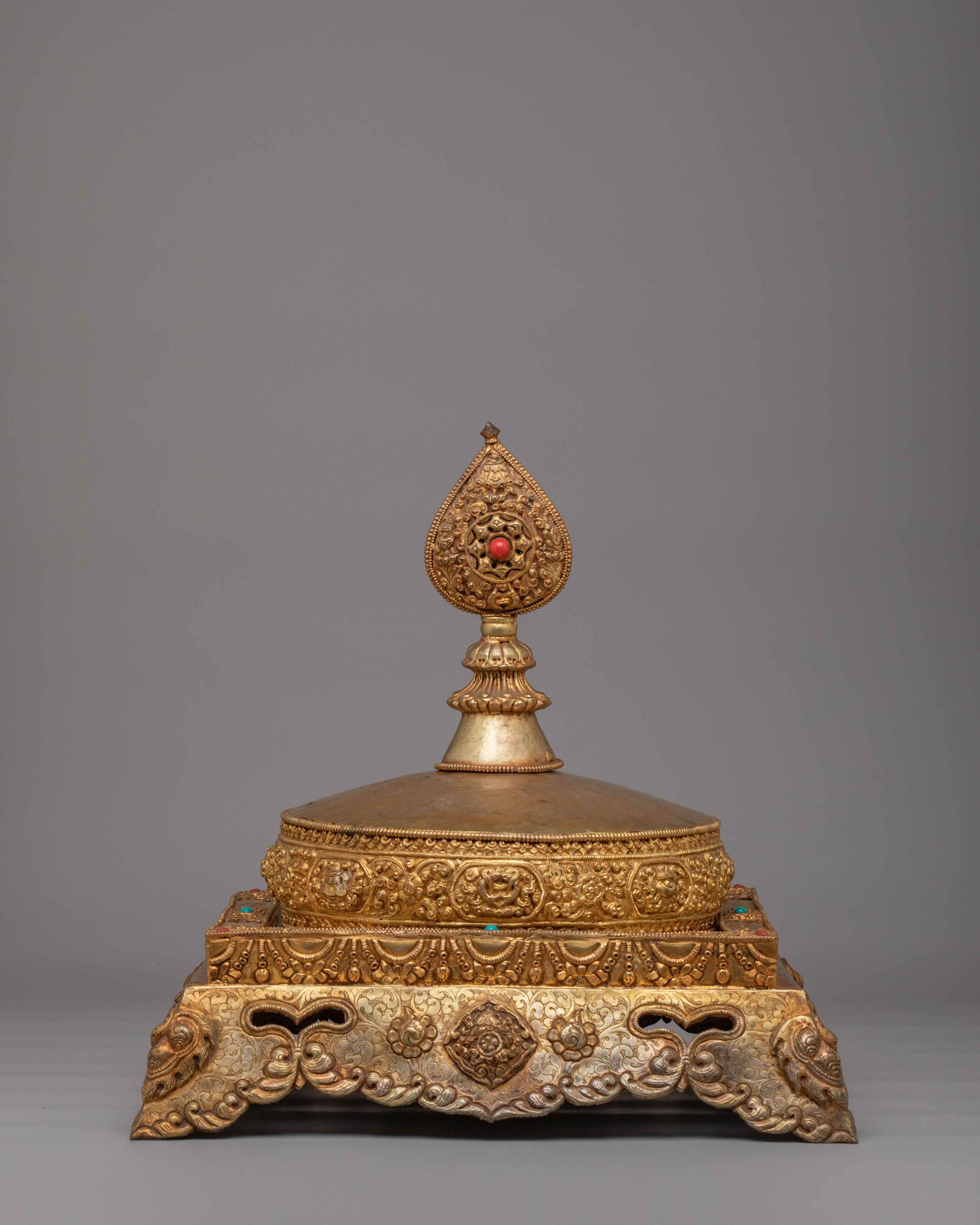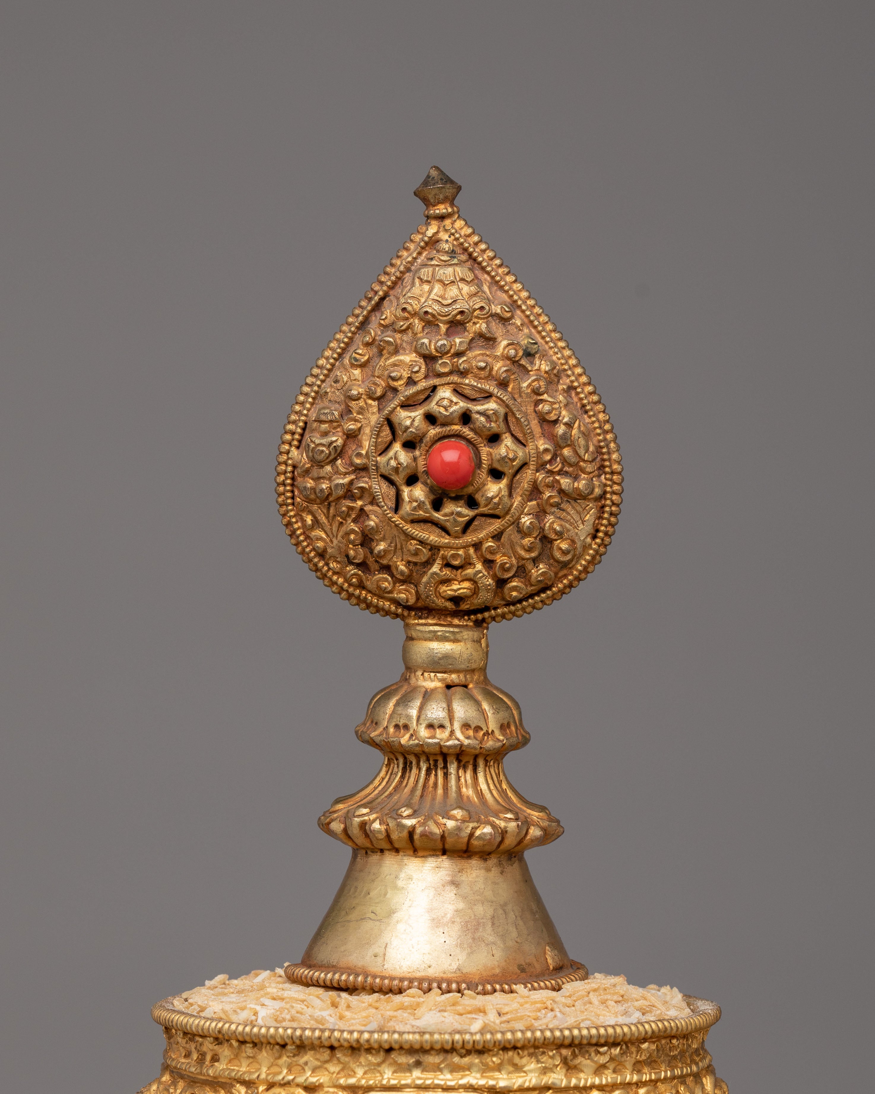 This Sacred Tibetan Mandala reflects the profound depth of Buddhist philosophy. The multi-tiered structure symbolizes the journey to spiritual awakening, with each layer representing different stages of enlightenment. The central red gemstone at the top signifies wisdom and clarity, while the surrounding gold-plated patterns embody harmony, unity, and the interconnectedness of all life. The Mandala’s geometric shapes align with the energy flow of the universe, offering a focal point for meditation and a reminder of the cyclical nature of existence. The Tibetan symbols integrated into the design bring protection, peace, and balance to the practitioner’s mind and spirit.