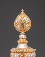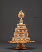 Crafted with care and love, this decorative Buddhist mandala embodies divine geometry, sacred spirituality, and inner tranquility. Made from copper, it is beautifully plated with gold and silver, creating a warm and cool color contrast that catches the eye. The addition of turquoise or artificial stone adds to its charm and symbolic significance. Measuring 35 cm tall, 25.5 cm wide, and with a mandala width of 16 cm, it’s a striking piece that radiates positive energy and can beautifully transform any space. Weighing 1.27 kg, it’s substantial enough to convey its importance while still being light enough to display with grace in various settings.