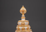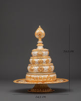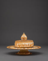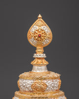 This exquisite handcrafted Mandala Sculpture is a gorgeous work of art, delicately constructed to bring spiritual energy into your environment. This gold and silver-plated copper sculpture is 29.5cm in height, 24.5cm in width, and has a mandala diameter of 13.5cm. The mandala, a renowned symbol in many cultures, represents the interconnectedness of all existence, promoting calmness, harmony, and mindfulness. It is an excellent complement to any room dedicated to meditation or personal reflection.