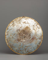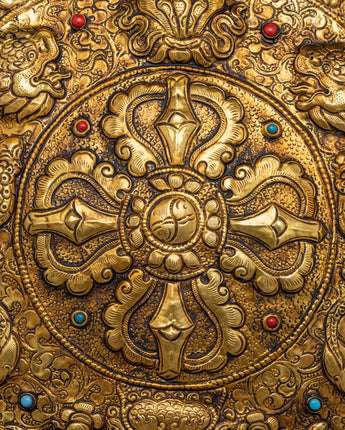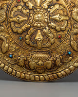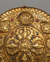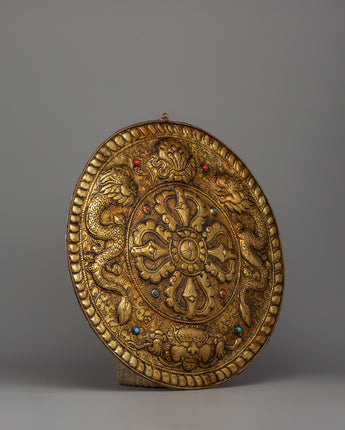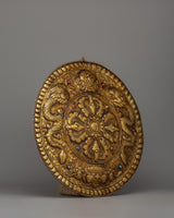Made of excellent brass, this detailed mandala features intricate engravings of dragons on the left and right sides with sacred symbols that demonstrate Tibetan artistic prowess and an offering symbol on top that represents generosity and compassion. At the base is a Kirtimukha, also known as Chhepu, who serves primarily as a significant guardian of the threshold. The double vajra (Bishwa Vajra) at the center denotes stability, divine connection, and the unbreakable strength of enlightenment. Each coral and turquoise inlay adds to the spiritual energy and visual appeal, making this an ideal altar ornament, wall hanging, or thoughtful gift for spiritual seekers.