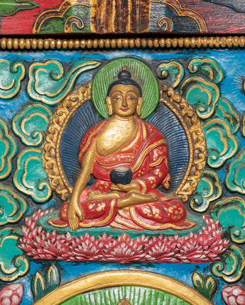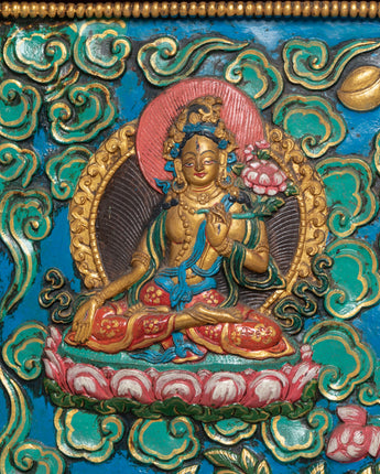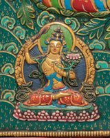 This Bodhisattva Chenresig Thangka Wall Hanging is an exceptional Tibetan devotional artwork crafted from stone dust with epoxy binding on a wooden back, measuring 90cm in height and 68cm in width, and weighing 8.59kg. The central figure of Chenresig is surrounded by exquisite details, including White Tara, Amitabha Buddha, and Green Tara, gracefully positioned above him. At the same time, Manjushri, sacred offerings, and Vajrapani appear harmoniously below. The background is enriched with flowing floral motifs, vibrant patterns, and traditional Himalayan ornamentation, highlighting the depth and cultural richness of the piece.