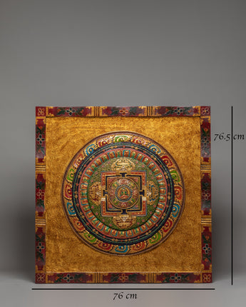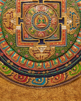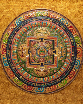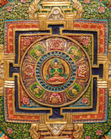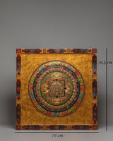The design of the Chenrezig wall hanging features the Bodhisattva in a serene seated posture, his hands forming the classic compassionate mudra, symbolizing empathy and the ability to ease suffering. The intricate mandala design surrounding him represents the unity of the cosmos and the eternal cycle of life. Chenrezig’s 1000 arms are depicted in the artwork, each hand holding a symbol of compassion and wisdom, reinforcing his boundless capacity to offer help and blessings. The vivid colors and golden accents make the piece come alive, while the stone dust epoxy binding ensures the longevity of the craftsmanship. The wooden back provides a sturdy frame, making it easy to hang in your home or spiritual space.
