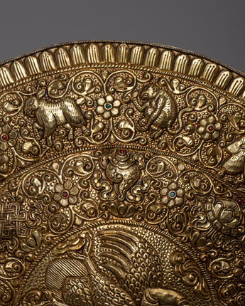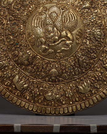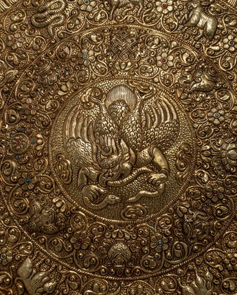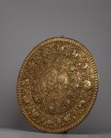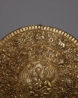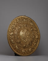 Carefully made on brass, the Garuda Brass Bird Wall Hanging Mandala is an enthralling combination of faith and artistic expression. The majestic Garuda, a bird of mythology that is highly respected in Tibetan Buddhism, dominates the design and stands for strength, protection, and freedom. Detailed carvings of auspicious symbols encircle the Garuda, adding to the artwork's spiritual value and encouraging reflection on the deeper implications of Buddhist philosophy.