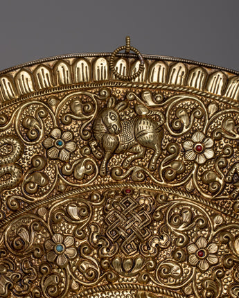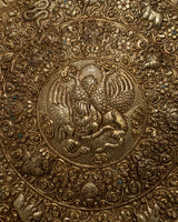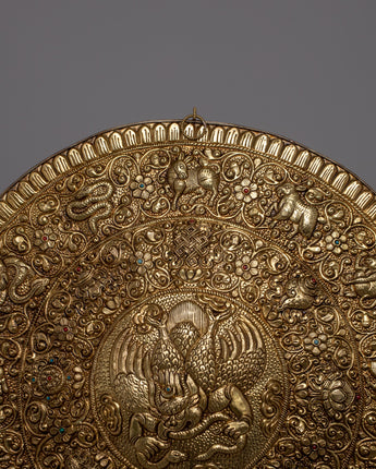 The incorporation of all twelve Tibetan zodiac signs, skillfully carved along the outside edge, adds layers of cultural complexity and symbolism to this wall hanging, making it unique. Beyond its aesthetic value, this mandala becomes a focal point for introspection and meditation, bringing its profound spiritual energy and ageless knowledge into any environment. Displayed in meditation areas, houses, or spiritual centers, the Garuda Brass Bird Wall Hanging Mandala uplifts the spirit and captures the eye.