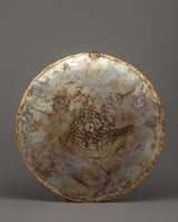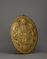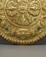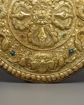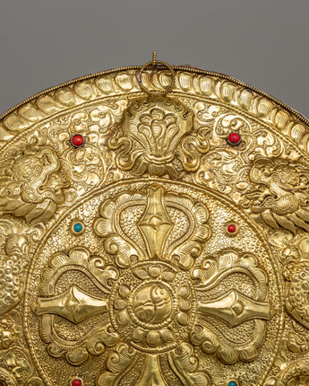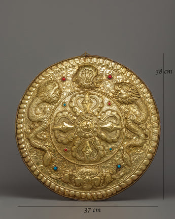 The Bishwa Vajra, located in the middle of the Mandala, represents spiritual power, knowledge, and compassion. The two fearsome dragons on the left and right sides of the Vajra represent strength and protection, respectively. The Kirtimukha, also known as Chhepu, serves mainly as a significant guardian of the threshold. The Offering symbol on top denotes generosity and compassion. This Mandala is a practical meditation, spiritual practice tool, and eye-catching décor for any sacred location.