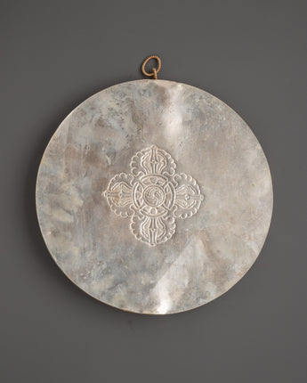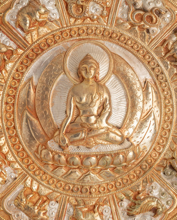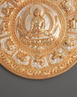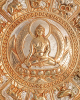 This Buddha, with 12 zodiac animals carved as a wall hanging mask, is a spiritual symbol of peace and cosmic harmony. This beautiful artwork, which measures 28.5cm in height and 27cm in width and weighs 0.67kg, is made of copper and plated with electro-gold and silver. The central meditating Buddha figure is surrounded by the 12 zodiac animals, each with a carefully drawn representation of its spiritual essence and importance in Buddhist cosmology.