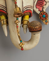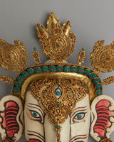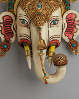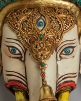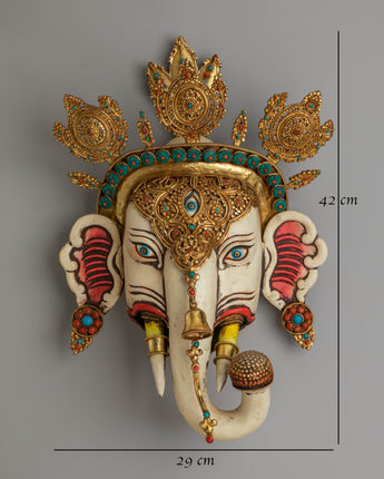 The design of the wall hanging showcases a highly detailed face with gemstone eyes and a gold-plated crown, representing divine protection and spiritual enlightenment. The gold-plated copper body not only adds a touch of elegance but also symbolizes the Buddha's wisdom and the transformative power of spiritual practice. The acrylic colors bring the face to life, highlighting the intricate patterns and symbolic motifs that represent the harmony between the earthly and the divine. The gemstones further enhance the piece's visual appeal, adding color and energy.