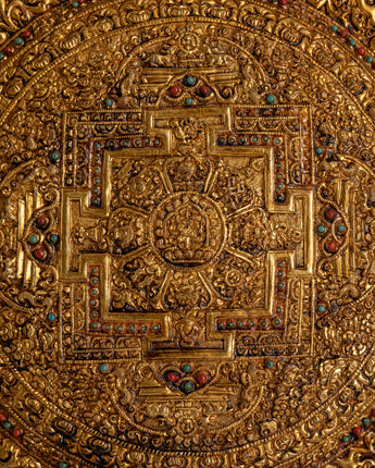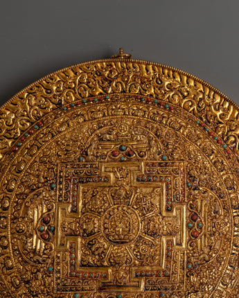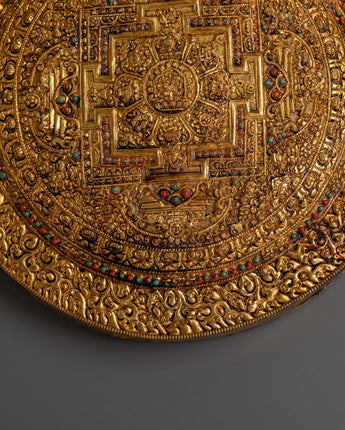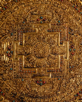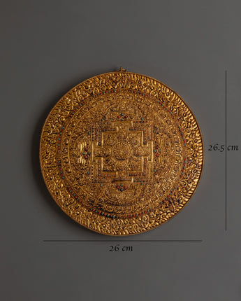 This elaborately crafted gold-plated copper wall hanging, inspired by traditional Tibetan and Hindu sacred art, features spiritual motifs and symbolic patterns that enhance its contemplative power. Beautiful light reflection from the glistening gold plating gives whatever wall it adorns a dramatic presence. It adds ethnic diversity and holy symbolism to both traditional and modern settings, making it perfect for yoga studios, temples, or spiritual sanctuaries. For individuals who want to add significant, fine art to their spiritual decor, this copper wall hanging is ideal. It can be used as a personal item to create a serene, holy space or as the perfect present for spiritual seekers.